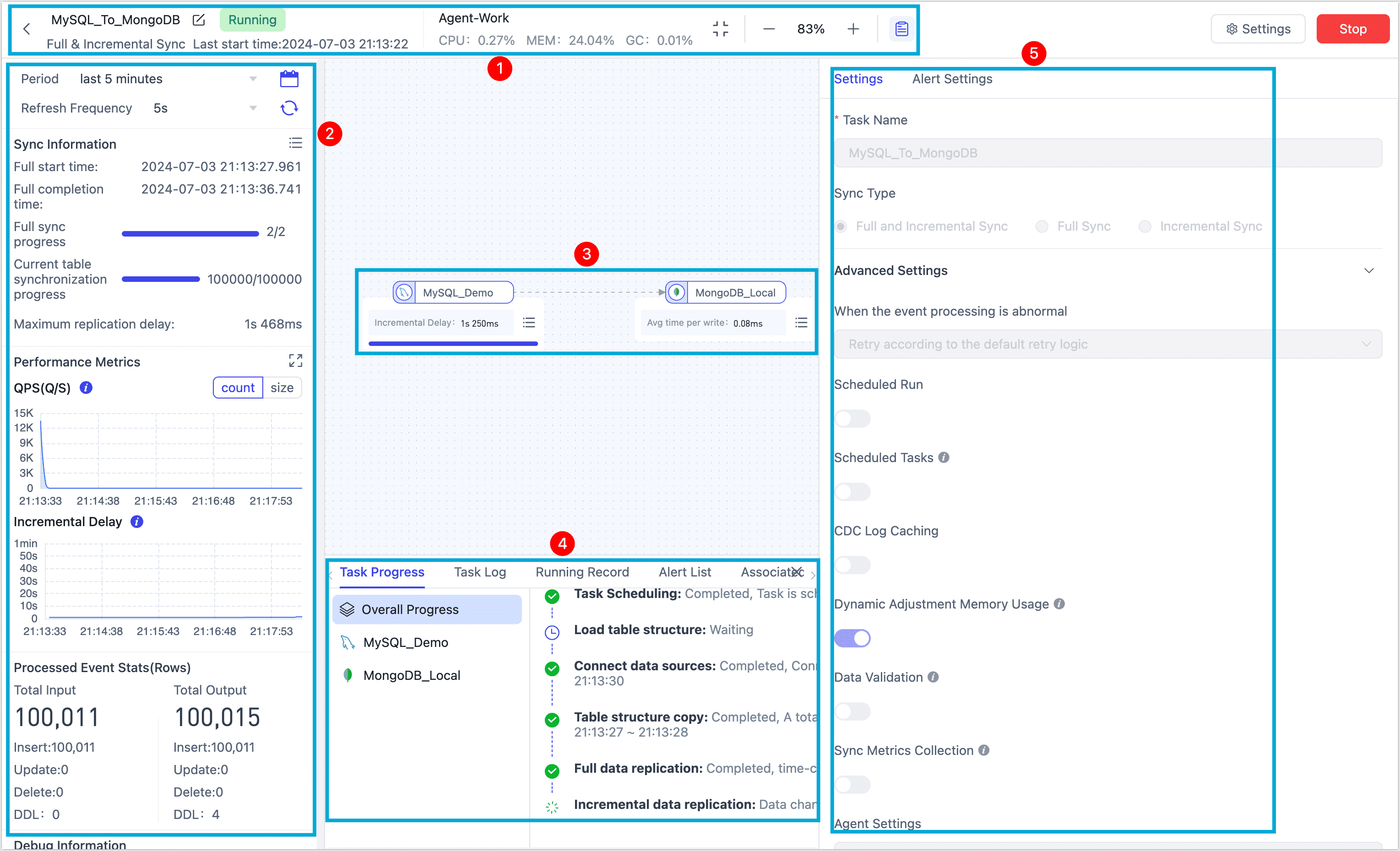 - Incremental Delay: The delay is calculated as the time it takes for an event generated in the source database to be processed and written to the target by the task. When there are multiple targets, only the maximum incremental delay time is considered, measured in milliseconds.