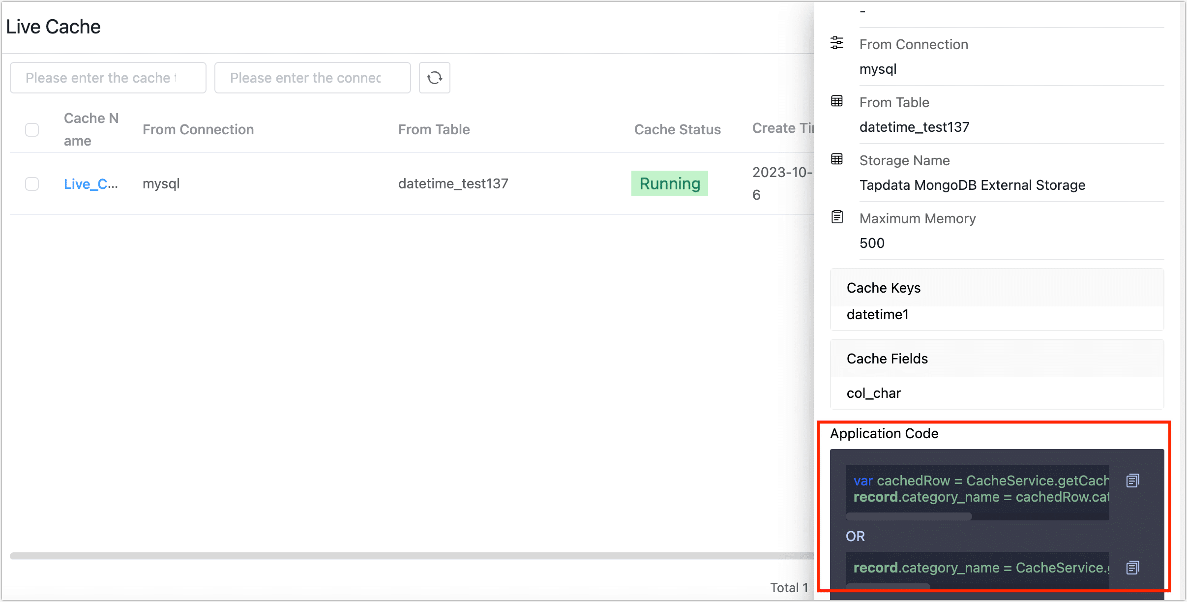 - Application Code: Generated based on the information filled in, can be copied and used in the JS node of the task to use this cache.