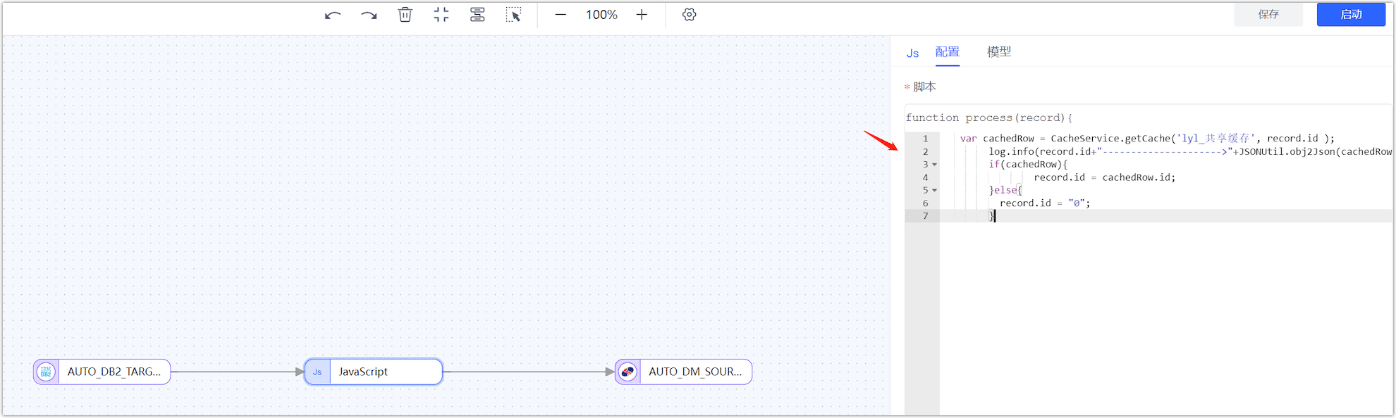 First, create a live cache, choose a connection as the cache middleware, copy the application code below, and finally create a development task in the JS node, pasting these codes, connecting the source and the target.